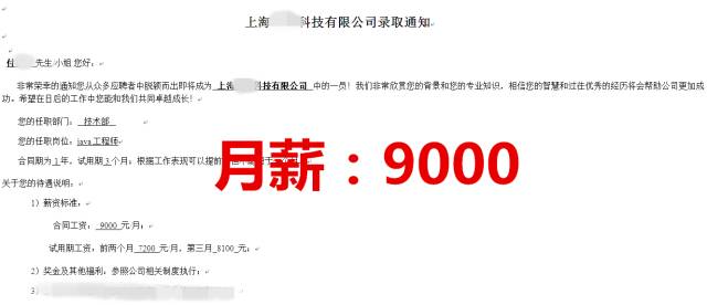 毕业后的付同学和同学们一起去了上海,他扎实的技能很快让他收到了多家OFFER,与就业老师沟通后选择了上海**科技有限公司,担任Java开发工程师,月薪9K。