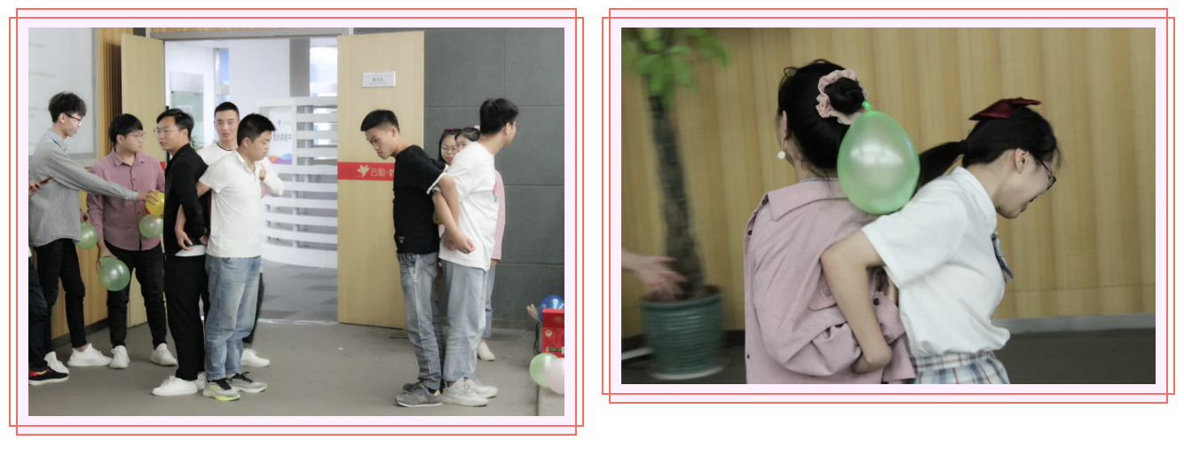 2人一组 ,背对背运气球 , 3分钟内运的多的班级胜。