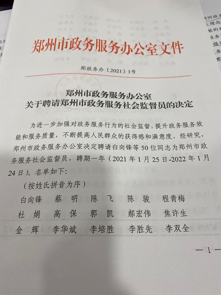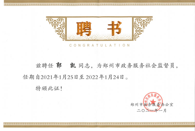 1月20日,郑州市政务服务办公室发布文件,聘请河南云和数据信息技术有限公司董事长郭凯为郑州市政务服务社会监督员。