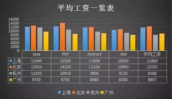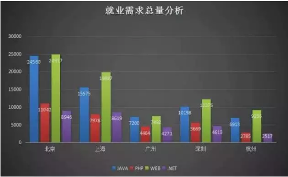 以北京上海广州深圳以及杭州这5个地区为例,分析Java、PHP、web前端以及net工程师的就业情况。就业需求量是反映该地区对特定职业职位的需求量大小。需求量越大的时候表示该职位在该地区越受欢迎,相对来说薪酬水平也会较高。