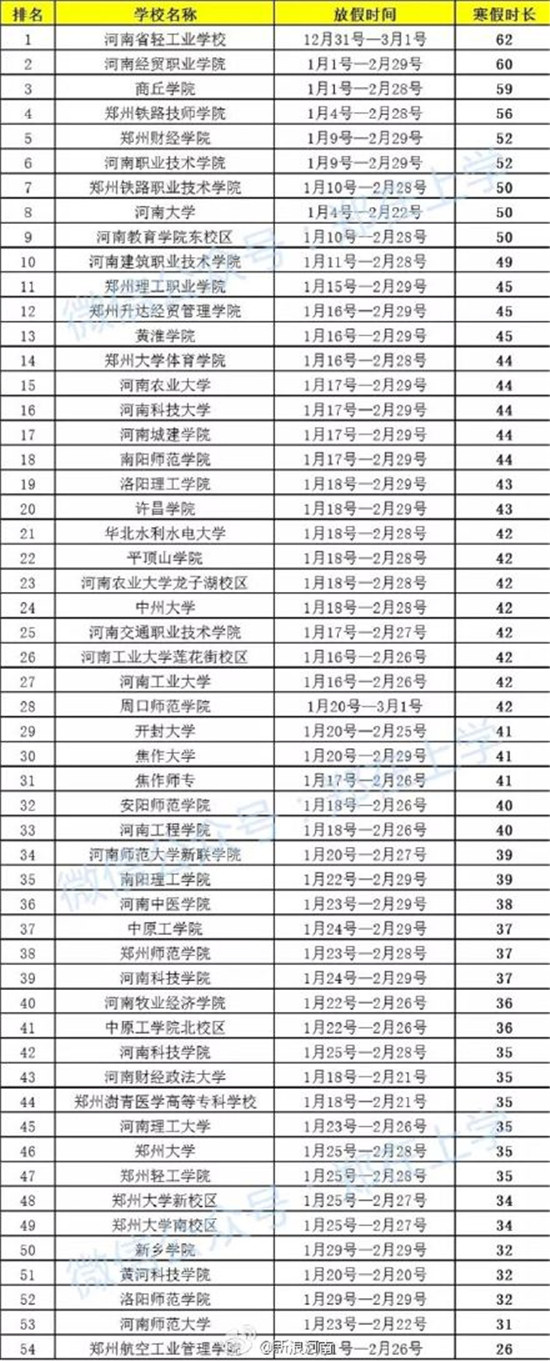 这个月,各大高校开始陆陆续续开启寒假模式,拿河南省的高校来说,寒假时长最长的是河南省轻工业学校,高达62天!排名最后的是郑州航空工业管理学院,只有26天假期!有网友调侃说,假期长的大学生就像是“富翁”,有大把的时间可以做自己想做的事情;假期短的大学生就像是“穷人”,睡几个懒觉一睁眼,假期就到头了,这个寒假放得真是“贫富悬殊”呀!