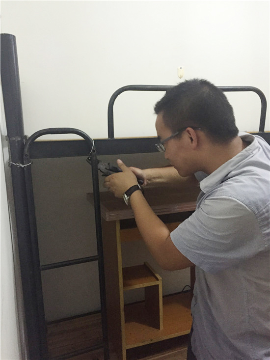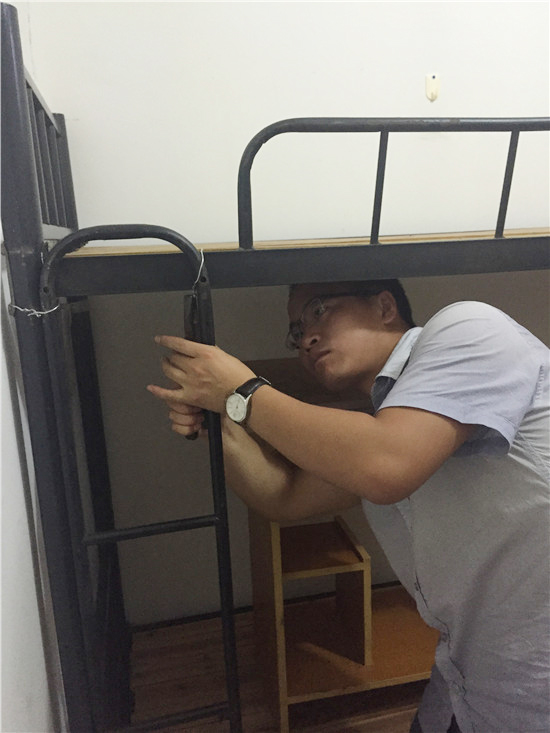 当完了“老爸”还得当“老妈”,安顿完学生们的行李,徐老大还要对宿舍的边边角角进行细致的检查,排除安全隐患,也是为身在异乡的学员们住得更舒适、更有归属感。由于宿舍的修理工不在,徐老大怕学员们干不来细活,所以亲自动手给学员们维修床铺。还不止这些,收发快递,抢收雨后衣服、给学员送雨伞……这些都是他的活。