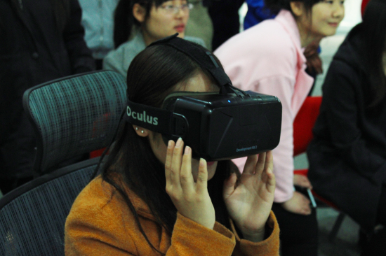 学生们体验了云和游戏自主研发的《过山车》和《云台山旅游》项目,前者充斥着速度与激情,后者可观赏唯美秀丽的大好风光。看着体验者双手紧扶眼镜、旁观者眼神专注,不时迸发出一阵尖叫或是大笑,你就知道过虚拟现实项目有多逼真啦~